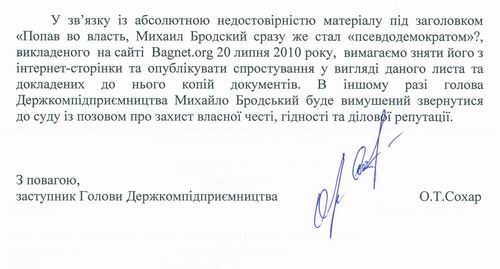 Декларируя на словах принципы свободы и демократии, нынешний глава Госкомпредпринимательства Михаил Бродский, похоже, отбрасывает общество в советские времена. Вместо того, чтобы обмениваться с журналистами информацией в установленном законом порядке, политик угрожает судами и пишет журналистам путаные письма, от которых за километр тянет неискренностью и «детской обидой». Точнее, пишет даже не он, а его заместитель по фамилии Сохар. Может быть, высокий начальник считает выше своего достоинства вообще каким-либо образом отвечать на вопросы журналистов?
