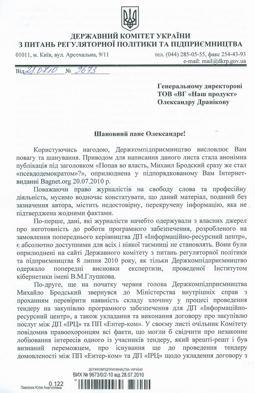 Рассказал, что информация о неготовности программного обеспечения, разработанного по заказу предыдущего (!) руководства ГП «Информационно-ресурсный центр», опубликована на сайте Госкомпредпринимательства 8 июля 2010 г. и секретом не является. Написал Бродский и о своем обращении к замминистра МВД с просьбой разобраться в нарушениях в работе предприятия (в том числе – и в нарушениях проведения тендера) в начале июня 2010-го (копии документов см. в фоторепортаже в конце текста). Улавливаете смысл? В мае Госкомпредпринимательства, со слов чиновников, журналистского запроса не получал (хотя выше приведенные документы свидетельствуют об обратном). Затем, после якобы "не полученного запроса, со скандальными вопросами, Госкомпредпринимательства тихонько, без шума "прикрывает задницу", пишет в июне гневное письмо в МВД, а в июле публикует информацию о нарушениях в ГП "ИРЦ" на своем сайте. У нас вопрос: а чего ж раньше, до журналистского запроса, который в Госкомпредпринимательства якобы не получали, Михаил Юрьевич не "бил тревогу"?! Чего ждал? Может, намеревался воспользоваться "неувязочками" неэффективного расходования бюджетных средств, если бы журналисты позабыли бы историю с запросом, на который никто не ответил?!