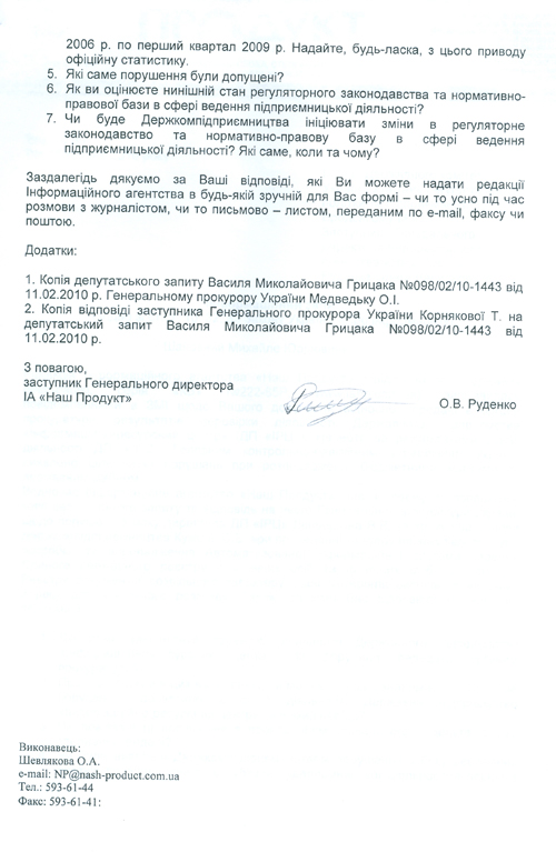 Более того, насколько известно «Багнету» от коллег, в возмущенном письме от 28 июля 2010 г. из Госкомпредпринимательства значится, что никакого запроса в адрес Михаила Юрьевича не поступало. Это полный абсурд – запрос был составлен на официальном бланке и, естественно, копия его сохранена в редакции (см. фото копии запроса и сопроводительных документов).