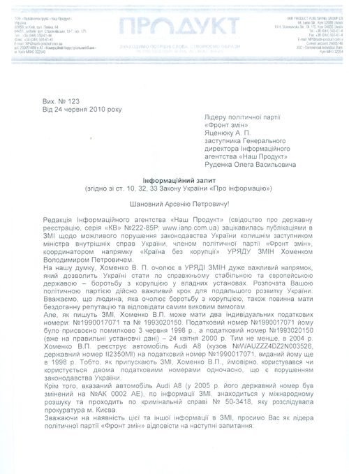 Все вопросы касались возможной противоправной деятельности господина Хоменко, в его бытность государственным служащим. От Арсения Петровича просили малого – всего лишь опровергнуть или подтвердить, что автомобиль Audi A8 был зарегистрирован на Хоменко Владимира Петровича в то время, когда он занимал пост главы Государственной налоговой администрации города Севастополя. Проходил ли указанный автомобиль по уголовному делу №50-3418, возбужденному прокуратурой города Киева? Зарегистрирован ли данный автомобиль на господина Хоменко в данный момент? Подтверждается ли информация о том, что господин Хоменко использовал два идентификационных кода и лоббировал интересы предприятия «Укрэлекон»?