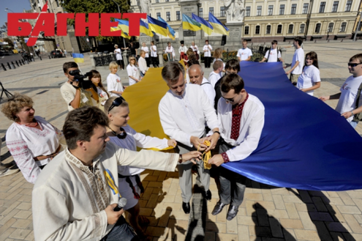 Шестиметровый украинский флаг, символизирующий объединение страны, сшили экс-председатель СБУ, координатор «Обновления страны» Валентин Наливайченко и около 100 активистов.