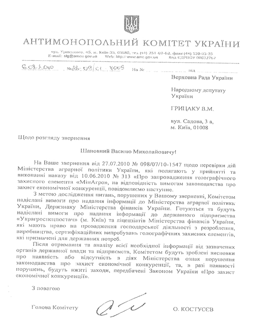 Аферой государственного масштаба по введению новой защитной голограммы в системе документооборота АПК, организованной руководством Минагрополитики, заинтересовался Антимонопольный Комитет Украины. Действия чиновников будут проверяться на предмет нарушения законодательства о защите экономической конкуренции. Комитетом уже разосланы соответствующие информационные запросы в МинАП и Госзнак. Также готовятся запросы в Минфин и предприятиям, имеющим лицензии на разработку и производство голографических защитных элементов (ГЗЭ). Об этом говорится в официальном письме АМКУ, адресованном народному депутату Василию Грицаку (см. ниже фото документа).