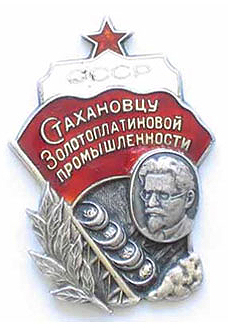 Значок стахановца золотоплатиновой промышленности, правда, на нем «дедушка Калинин» больше смахивает на Льва Троцкого (Сегодня этот знак очень редкий, поскольку многие его владельцы так и остались там, где стали стахановцами золотоплатиновой промышленности…)