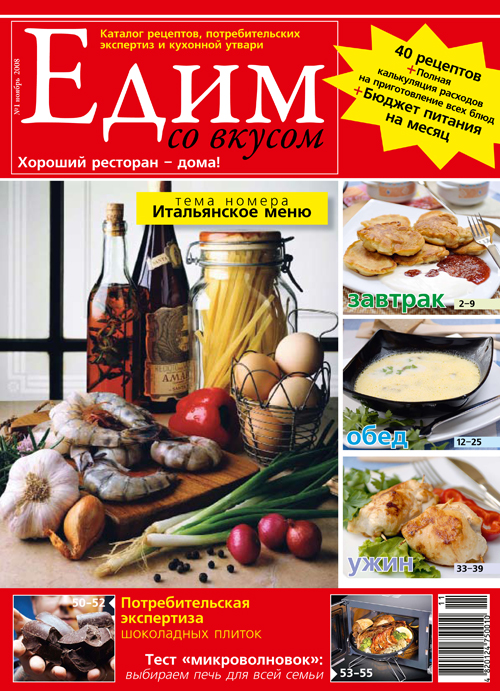 Каталог рецептов «Едим со вкусом» поможет не только составить семейное меню на целый месяц, но и подскажет, во сколько оно обойдется семейному бюджету. В первом же номере издания содержатся не только рецепты 40 блюд, но и подробная калькуляция расходов на их приготовление.