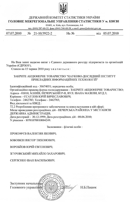 Возникает вполне закономерный вопрос – не слишком ли много рычагов отдано в руки частной структуры. А о том, что это частная компания свидетельствует документ – справка Госкомстата (см. ниже фото документа). А из нее явственно следует, что в ЗАО «НИИ ПИТ» учредителями являются 5 физлиц.