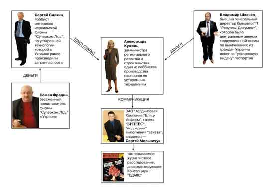 А «продвигала» статью в «Бизнес», пользуясь старыми связями, сама Александра Кужель (газета неоднократно ее «пиарила» в должности главы Госкомпредпринимательства) – ярый «борец» за справедливость, замминистра регионального развития и строительства, президент аналитического центра «Академия». Она же, на пару с Силкиным и Ко – старый лоббист технологий «Суперкома» и ярая противница нового загранпаспорта (см. схему).
