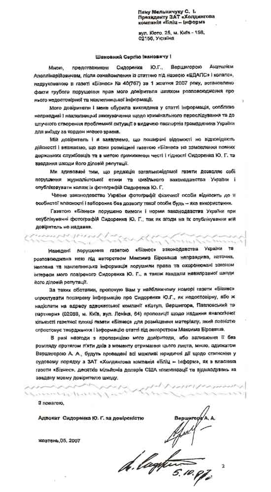 Не гнушаются «расследователи» и просто мелким подлогом. Так, на представленной «схеме бизнес-империи Сидоренко» фотография самого Сидоренко – не более, чем коллаж. О чем, кстати, адвокат бизнесмена А. Вершигора пишет владельцу «Бизнеса» Мельничуку, предупреждая обо всех юридических последствиях таких действий (см. фото).