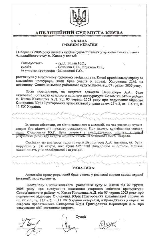 Поражает и однобокость в предоставлении документов. Вот, к примеру «Бизнес» с плохо скрываемым злорадством публикует документы о возбуждении уголовного дела против Сидоренко, но «забывает» упомянуть о том, что Апелляционный суд Киева признал, что уголовное дело против Сидоренко вообще не могло быть возбуждено – для того отсутствовали всякие основания (см. фото).