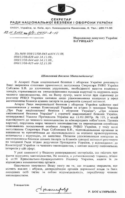 По сути, не ответ, а отписка. Мол, «проявів корупції, порушень норм... заступником Секретаря Ради Соболєвим Б.В.... не виявлено». В письме Богатыревой говорится, что вопрос усовершенствования контроля над производством бланков строгой отчетности поднят с целью усовершенствования национальных интересов. И, снова, ни слова по сути заданных вопросов: от кого получены фальшивые марки?