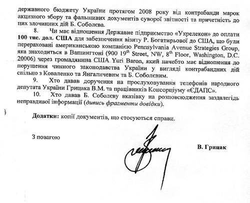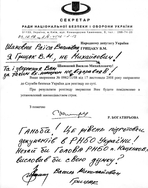Подобные ассоциации вызывают ответы Богатыревой на депутатские запросы. В распоряжении «Багнета», оказался ответ секретаря СНБО на имя парламентария Грицака В.Н. В ответе Богатырева называет его Василием Михайловичем и ссылается на номер депутатского запроса, который ей Грицак Василий Николаевич не отправлял (см. фото ниже).