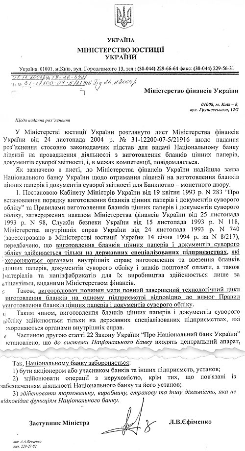 Правоведы из Минюста вообще недоумевали - о каких лицензиях применительно к Нацбанку Украины может идти речь? Ведь НБУ – центральный орган государственного управления, основной функцией которого является обеспечение стабильности денежной единицы. Причем здесь бизнес на печати бланков, господа банкиры? Вы бы лучше за курсом валют следили! (фото письма Минюста в адрес Минфина см. ниже).