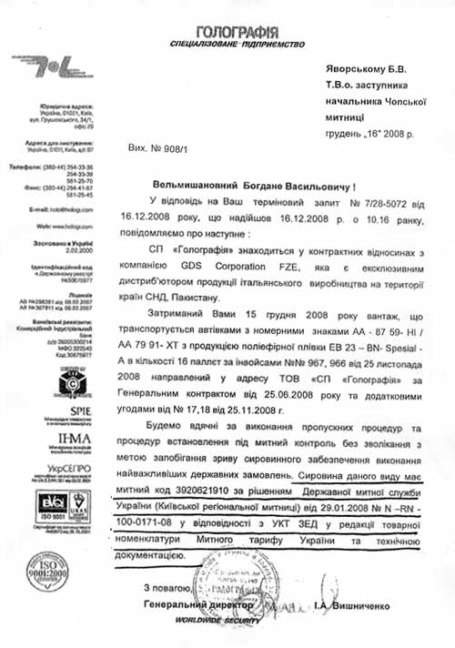 Как следует из пояснений «Голографии» в адрес упомянутого Яворского (см. ниже фото документа), пленке для голограмм, решением Киевской региональной таможни Гостаможслужбы Украины, присвоен таможенный код 3920621910. То есть, при транспортировке данного груза соблюдены все возможные формальности. И именно по коду, присвоенному Гостаможслужбой, пленка завозилась в страну, и по этому же коду растамаживается с уплатой всех необходимых платежей. Помимо этого – на таможенный пост «Тиса» груз прибыл опломбированным по всем правилам, а процедуры таможенной очистки следовало бы проводить по месту следования груза, то есть в Киеве, на Киевской региональной таможне.