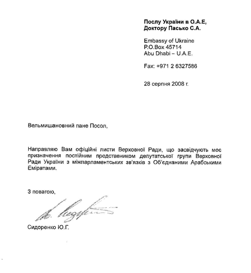 У Сидоренко отыскалось и письмо в благодарность за предоставленную Посольству Украины в ОАЭ помощь в организации празднования 17-летия Независимости Украины (см. ниже фото документа).
