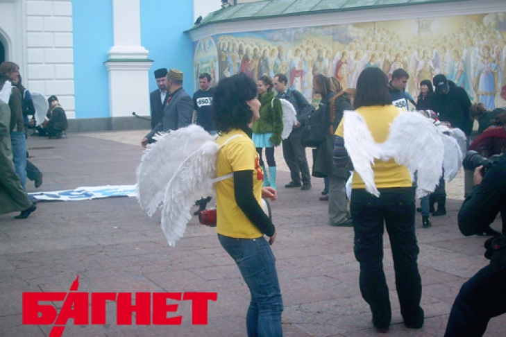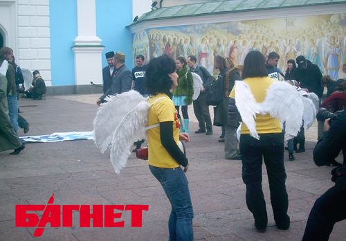 А затем провели концерт, с участием очаровательных ангелочков из детского фольклорного ансамбля В это время на Владимирском спуске активисты из Национального эко-центра Украины и Ассоциации велосипедистов Киева рисовали велосипедную дорожку