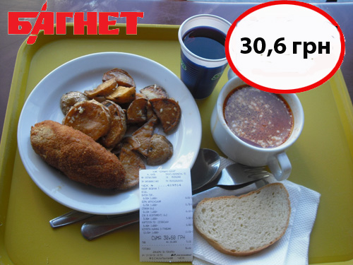 4. Обедать в киевских столовых или «ресторанах быстрого питания» - дело не из дешевых, хотя в рекламе таких заведений акцент делают именно на их доступности для широких масс населения. Мы взяли среднестатистический обед, пытаясь уложиться хотя бы в 30 гривен. Почти удалось: за борщ, жареную картошку, куриную котлетку, кусочек хлеба и сок мы заплатили 30,6 грн. На протяжении недели мы еще три раза обедали в столовой, но потом пришлось затянуть пояс и кушать целый день принесенные из дома яблоки. За неделю в столовой мы оставили 122,4 грн. Вывод: обед надо брать с собой на роботу.