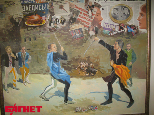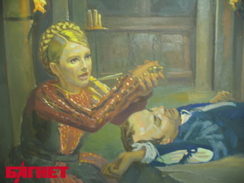 По словам автора выставки, которая состоит всего из 4 полотен, художественный сюжет заканчивается почти по Шекспиру: «Шуфрич отравлен, а Тимошенко себя закалывает кинжалом».