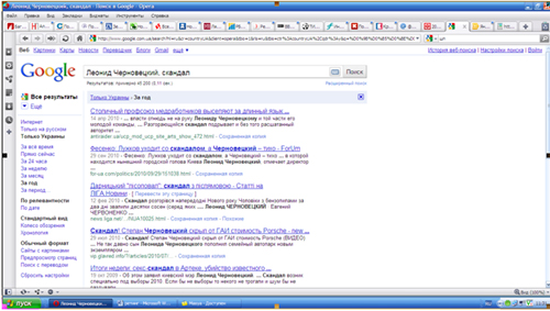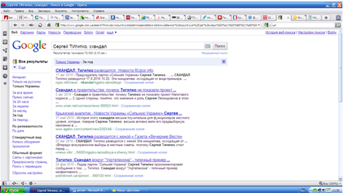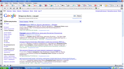 На первом шаге процедуры мы решили определить десятку самых упоминаемых в Google бизнесменов из отобранного списка. Как и в предыдущем рейтинге, для получения более точного результата были заданы следующие параметры поиска: «имя, фамилия», установлены фильтры «в Украине» и «За год». Таким образом, в результате учитывались интернет-страницы только украинского сегмента сети, где тот или иной бизнесмен (полные фамилия и имя) упоминался бы не позднее 12 месяцев тому. Выборки проводились 14 октября, в Киеве, через браузер Opera.