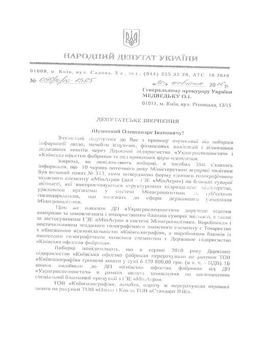 Парламентарий, в частности, упоминает о том, что госпредприятие «Киевская офсетная фабрика», которое является производителем бланков ДСО, в августе перечислило «Киевголографии» почти 6,5 млн. грн. «Офсетка» получила эти деньги от ГП «Украгроспецпостач», которому Минагрополитики поручило контроль в отрасли за производством ДСО и использованием «МинАгро». «Киевголография» тут же отправила полученные деньги двум ООО – «Олимп и Ко» и «Стандарт ИНК». На первый взгляд, по словам Грицака, эти финансовые операции проводились в рамках законодательства. Однако при ближайшем их рассмотрении этот факт становится, мягко говоря, не столь очевидным.