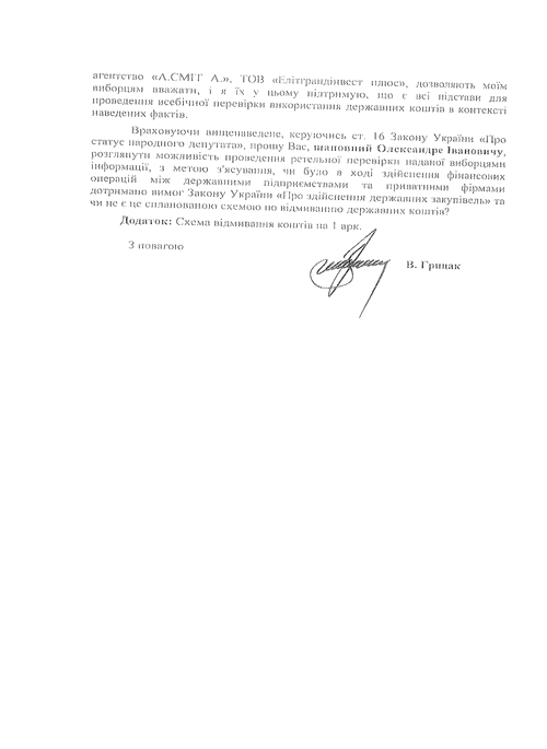 Все вышесказанное, дает право предполагать, что раскрыта хорошо отработанная схема отмывания бюджетных средств. По словам Грицака, его избиратели считают, и он их в этом поддерживает, что есть все основания для проведения Генпрокуратурой всесторонней проверки использования государственных денег.