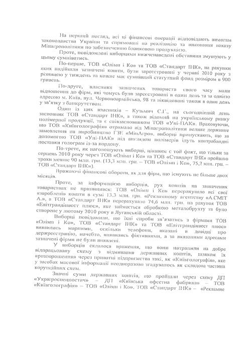 Во-первых, оба эти ООО зарегистрированы в июне 2010 года с разницей в одну неделю, и имеют сомнительный уставный фонд в 900 грн. Во-вторых, собственники «Олимп и Ко» и «Стандарт ИНК» в свое время имели отношение к компаниям, которые почему-то были зарегистрированы в один день по одному адресу (г.Киев, ул.Красноармейская, 98), и точно также в один день «умерли», то есть были ликвидированы в связи с банкротством. Кроме того, один из основателей «Стандарт ИНК» – некий Кузьмич Е.Г., известная личность на украинском рынке полимерной продукции, является совладельцем компании «Уни-ПАК». Есть предположение, что «Уни-ПАК» под видом полимеров контрабандным путем может ввозить в Украину голограммы для «Киевголографии». Ведь последняя вряд ли способна справиться со столь масштабным государственным заказом на их производство. Особенно если учесть, что все ее «производственные мощности» умещаются в подсобке овощного магазина. Далее, по имеющейся у депутата информации, от «Олимп и Ко» и «Стандарт ИНК» деньги уходят «Рекламному агентству «А.СМИТ А.» и ООО «Элитграндинвест плюс» – было перечислено 13,3 и 74,6 млн. грн. соответственно. Стоит также упомянуть о том, что «Элитграндинвест плюс», равно как и «Олимп и Ко», а также «Стандарт ИНК» оказались фиктивными компаниями, у которых нет реальных фактических адресов и телефонов.
