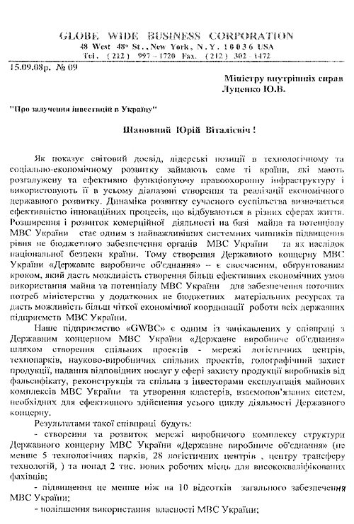 Похоже, что с помощью чиновника Владимира Хоменко в МВД готовится крупномасштабная афера по выкачиванию из Украины бюджетных средств. В распоряжении «Багнета» оказалось прелюбопытное письмо некой фирмы «Globe Wide Business Corporation» (GWBC, США) к МВД с предложением инвестировать денежные средства в развитие министерства, в частности в создание государственного концерна МВД Украины «Государственное производственное объединение» (см. ниже фото документа).