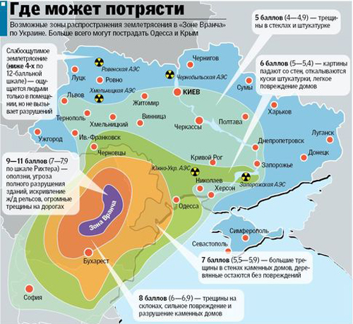 Ученый напомнил, что в прессе не так давно появилась информация о том, что в ближайшее время Украине стоит ждать серию мощных землетрясений, эпицентр которых расположен в зоне Вранча. По его словам, информация не совсем достоверна, так как сейсмологи не могут предсказать землетрясение во времени, однако зона Вранча действительно сейсмоактивная и сильные землетрясения возможны.