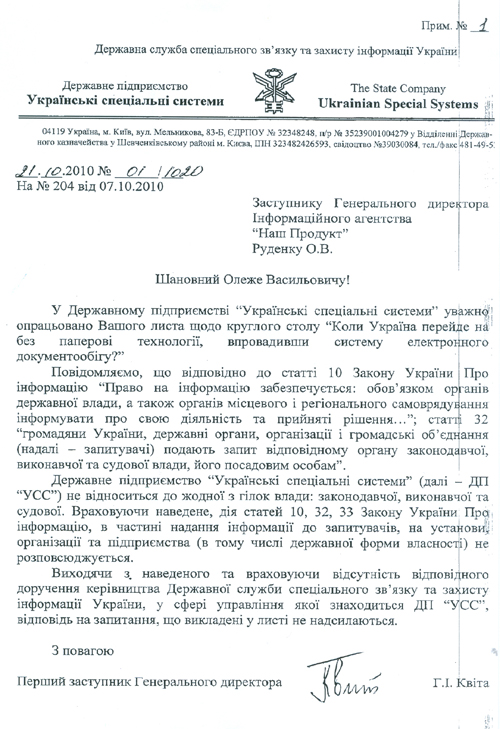 Как минимум, странный ответ на свой журналистский запрос получили наши коллеги из ИА «Наш Продукт». По результатам информации полученной от ИТ-специалистов в ходе круглого стола «Когда Украина перейдет на безбумажные технологии, внедрив систему электронного документооборота?» ими были направлены соответствующие информационные запросы в различные структуры, в том числе и подведомственному Госспецсвязи госпредприятию «Украинские специальные системы».