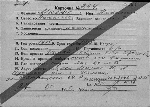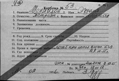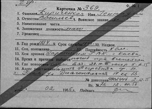 По всей стране разошлись похоронки, но не до всех они дошли. Ведь только на 512 человек были заполнены карточки-формуляры по учету погибшего личного состава. Но увы. Дошли они не до всех, учетные данные оказались, во многом, неточными.