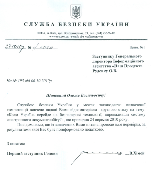 Служба безопасности Украины проводит проверку по сути вопросов, изложенных в информационном запросе ИА «НАШ ПРОДУКТ», относительно разработанной Госспецвязи системы электронного документооборота государства.(см.фото)