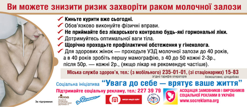 Вчера, 28-го октября, стартовала социальная кампания против рака молочной железы в киевском метрополитене. Реклама проходит в рамках социальной кампании «Внимание к себе – спасет Вашу жизнь!», стартовавшей 19-го октября по инициативе «Ассоциации заказчиков и производителей социальной рекламы».