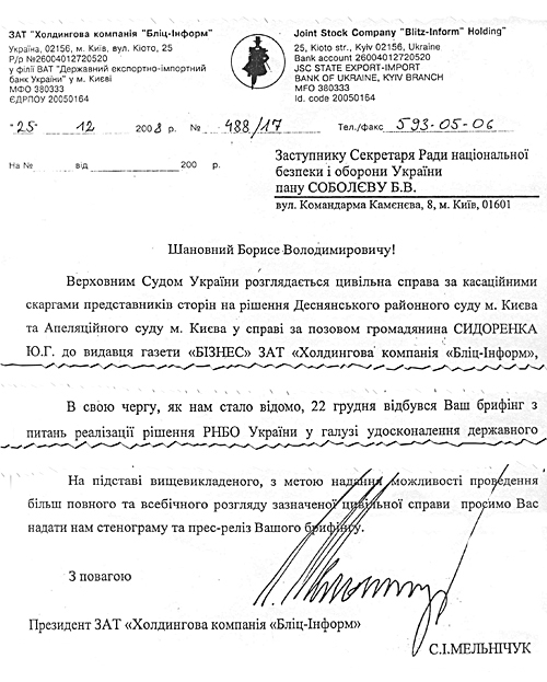 И вот эту ничем не подтвержденную ложь, за которую, кстати, уже подан иск в суд против Соболева, «Блиц-Информ» решил использовать в суде же против Консорциума «ЕДАПС». Честные работники СНБОУ, которые все же, еще остались в стенах этого учреждения передали в редакцию «Багнета» прелюбопытнейший документик: письмо Мельничука в адрес замсекретаря Бориса Соболева (см. фото документа ниже). В нем Мельничук, за неимением документальных свидетельств своей правоты по иску Юрия Сидоренко к «Блиц-Информу», просит Соболева «…предоставить стенограмму и пресс- релиз брифинга».