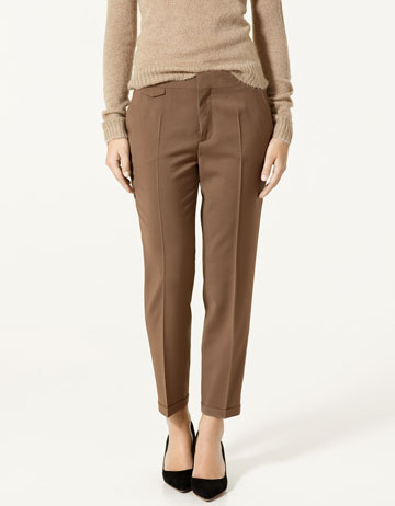 Укороченные шерстяные брюки модного бежевого цвета – идеальная составляющая повседневного гардероба. Сочетаются как с ботинками на низком ходу, так и с боти льонами и полусапожками на высоком каблуке. Носите эти брюки со свитерами или классическими сорочками и жилетами. Самые подходящие аксессуары – кожаные коричневого цвета или сделанные из золотистого металла. Выбирайте модели, сшитые из натуральной шерсти – они станут хорошей инвестицией и прослужать вам не один сезон.
