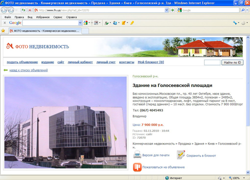 «Я увидел фото здания Голосеевской РГА в разделе «Продажа коммерческой недвижимости». Рядом – цена 7,9 млн долларов. Невероятно удивился. Однако все сомнения развеялись, когда я позвонил по указанному номеру некому Владимиру. Тот подтвердил, что продает именно «райгосадминистрацию». Более того, на официальном сайте Голосеевской РГА – тоже фото ее нового здания», - рассказал секретарь фракции «Республика Киев» Алексей Давыденко.