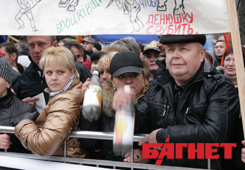 Предприниматели вооружились пустыми ведрами и пластиковыми бутылками с мелочью. Они выкрикивают: «Ганьба!», «Разом нас багато…», «Підприємці не раби».