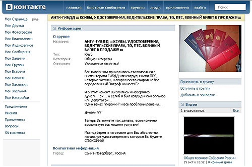 В не менее популярной российской социальной сети «В Контакте» существуют сразу несколько групп, создатели которых могут «помочь» в получении паспорта, военного билета, прав и т.д.