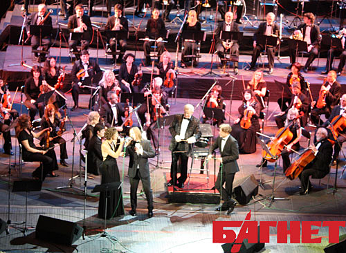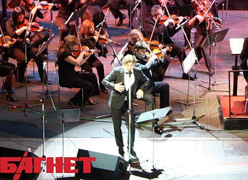 Итак, Би-2 вновь привезли в Киев программу с симфоническим оркестром. Кому еще не доводилось видеть Леву и Шуру Би-2 во фраках, сообщаю, картинка стоящая, хоть и немного забавная. Чем именно? Ну вот Шура, к примеру, даже ради такого грандиозного действа как концерт в оперном остался верен себе и пирсинг из губы вынимать не стал. А Лева…весь его образ, в виде строгого черного костюма, бабочки и гладкой прически сходил на «нет» благодаря головокружительным па, его бедер, от которых женщины в зале нервно ерзали на стульях. Музыка Би-2 в исполнении Одесского симфонического оркестра, под руководством дирижера Феликса Арановского, звучала настолько органично, что, казалось бы, написана специально для него. Хотя, если честно, так, из-под полы признаюсь, что лично мне гитарки и басов не хватало. Но, это так, мое замечание. Не уверена, что его разделят те, кто присутствовал в зале.