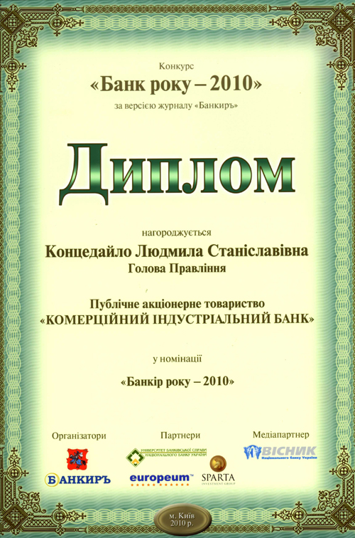 Кстати, во время награждения победителей второго ежегодного конкурса «Банк года-2010» председатель правления ПАО «Коммерческий Индустриальный Банк» поднималась на сцену дважды, ведь ей была присуждена специальная премия в номинации «Банкир года». И эту награду также можно считать вполне закономерной, ведь, вопреки негативным явлениям в экономической и финансовой сферах государства, банк продолжает быть в кругу лидеров банковского дела и оставаться рентабельным.