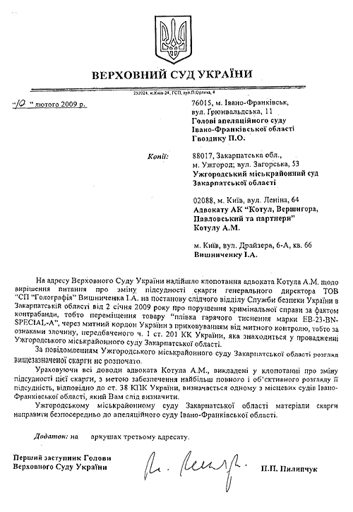 Как стало известно «Багнету», сегодня, 10 февраля, Верховный Суд Украины удовлетворил ходатайство адвокатов СП «Голография» (см. фото документа) о том, чтобы жалоба предприятия на постановление СБУ о возбуждении уголовного дела (от 02.01.09 г.) рассматривалась не в Ужгородском городском районном суде, который до сих пор не приступил к рассмотрению данной жалобы.