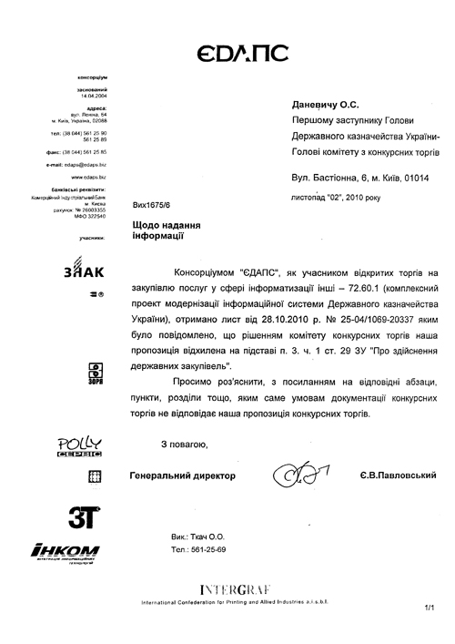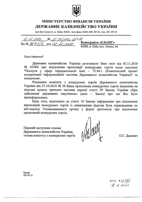 В результате, по их итогам представитель консорциума «ЕДАПС» Сергей Олейник сообщил прессе, о весьма предвзятом отношении руководителя торгов, директора Департамента информационных технологий и корпоративной телекоммуникации Олега Ковтонюка к предложению «ЕДАПС».