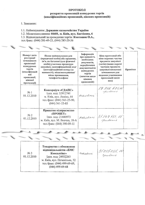 Сейчас, когда торги состоялись и предложения участников раскрыты, думаю, есть общественная потребность узнать о суммах денег, за которые готовы осуществить «Комплексный проект модернизации информационной системы ГКУ». Так вот, «ЕДАПС» предлагает выполнить эти работы за 17 956 671,00 грн., ЧП «Пронет» за 35 847 533, 28 грн. И уже известный нам по первым торгам в Госказначействе ООО «БМС - Консалтинг», который просит за эту работу 35 035 035,00 грн.