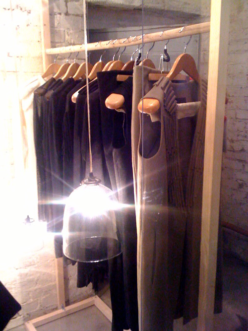 Лаконичные жакеты, юбки и свитеры из шерсти дизайнер Анна Пинько поместила в инсталляцию из прозрачного пластика. Корнер подсвечивают обыкновенные лампочки в плафонах из прозрачного стекла, подвешенные на длинные провода.