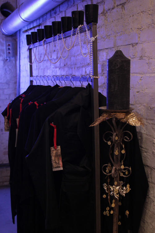 В коллекции Владимира Подоляна – только вечерние наряды черного цвета. Дизайнер иронизирует над готикой, украсив инсталляцию свечами в черных подсвечниках и гирляндой из дешевого искусственного жемчуга.
