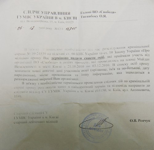 Далее Олег Тягнибок без каких-либо комментариев публикует письмо ГУ МВД Украины в городе Киеве: