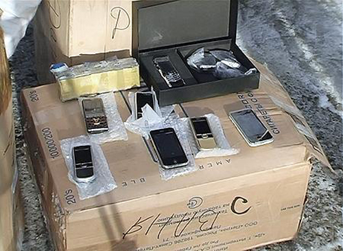 При детальном обыске машины правоохранители в картонных коробках нашли десятки сотен деревянных матрёшек, расписные ложки и… 300 килограммов красной крупнозернистой икры и еще полтысячи мобильных телефонов.