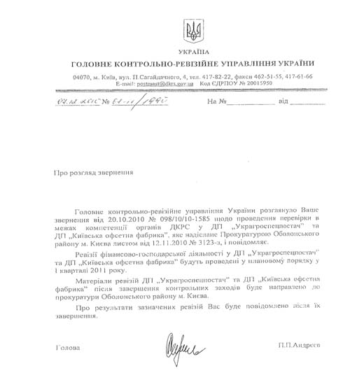 Главное контрольно-ревизионное управление проведет ревизии финансово-хозяйственной деятельности ГП «Украгроспецпостач» и ГП «Киевская офсетная фабрика». Об этом говорится в официальном ответе КРУ на соответствующий запрос. Напомним, что эти госпредприятия, возможно, являются звеньями конвертационной цепочки, и причастны к схеме «обнала» бюджетных денег. (см.фото)