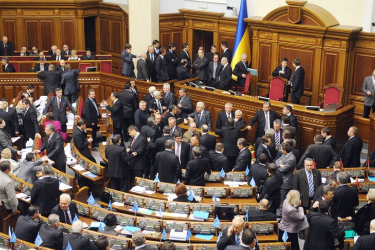 Сегодня в Верховной Раде утреннее заседание не смогло начаться в 10:00 как положено по регламенту. Представители оппозиционных фракций заблокировали президиум и правительственную ложу. Над президиумом и в ложе правительства развешаны транспаранты, текст которых раскрывает то, что в данный момент больше всего интересует парламентскую оппозицию.