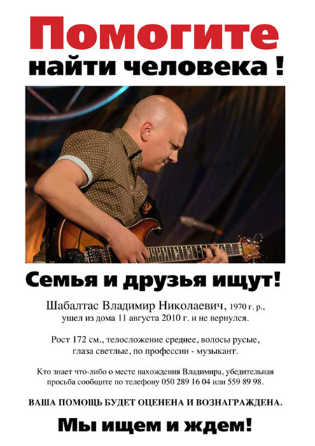 А произошло то, что 11 августа 2010 года известный музыкант, бывший гитарист лучшей джазовой группы Украины Схід-Side, лидер собственного проекта «Shabaltas Band» и участник инструментального состава группы «ВИА Гра» Владимир Шабалтас вышел из дому и до сих пор не вернулся.