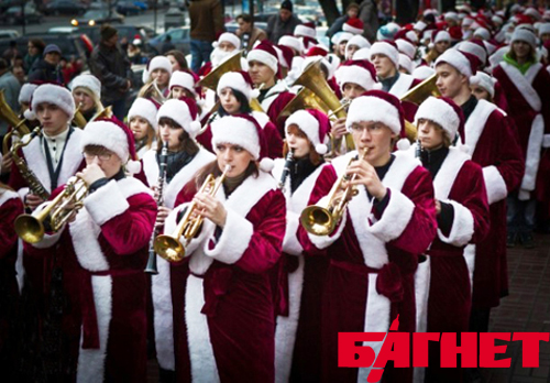 Началось праздничное действо в 15.00 – именно тогда стартовал поход более 200 одетых в костюмы Дедов Морозов и Снегурочек волонтеров от Бессарабской площади в направлении Майдана.