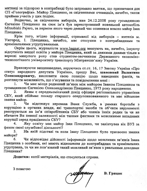 Народные депутаты заинтересовались и деятельностью закарпатских «пехотинцев» Балоги. В частности народный депутат Василий Грицак направил в адрес и.о. председателя СБУ Валентина Наливайченко запрос (см. фото документа) относительно уже упомянутого майора СБУ Ивана Плещенко, который, как писал «Багнет» имеет дорогой джип на $60 тыс. (на нем он приехал «захватывать» СП. «Голография») и особняк за $300 тыс.