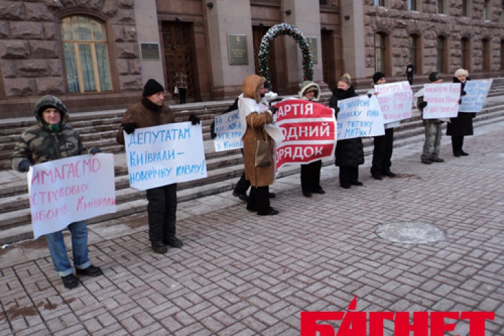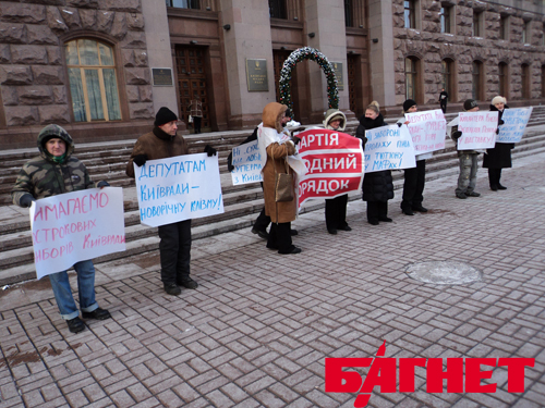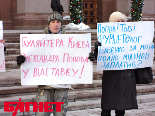 Организаторами акции выступили партия «Народный порядок», Гражданская кампания «Общественное сопротивление Украины». Митингующих собралось ну очень немного – всего девять человек, если не считать их «главнокомандующего». В руках они держат плакаты с надписями «Ні сухому закону від лобістів супермаркетів з Київради», «Попов! Тобі «фуршетник» Бабенко за монополію мільйони заплатив?» и далее в таком духе.